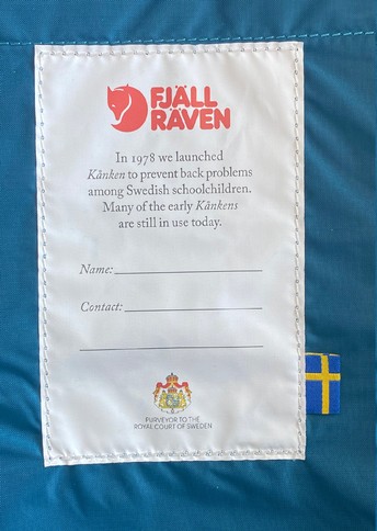 Dočítate sa tu, že Kånken bol prvýkrát vyrobený v roku 1978, aby sa predišlo problémom s chrbtom u švédskych školákov. Štítok taktiež umožňuje vpísanie osobných údajov vlastníka. Majte na pamäti, že vnútorný štítok vášho originálneho Kånken má farebnú potlač švédskeho erbu v dolnej časti (Purveyor to the Royal Court of Sweden). V imitáciách je potlač zvyčajne čiernobiela. Môže sa stať, že potlač švédskeho erbu u originálneho batohu úplne chýba. Je to tak v prípade, že sa jedná o batoh vyrobený pred rokom 2019. U falzifikátov väčšinou chýba tiež znak "Å" v slove Kånken.
